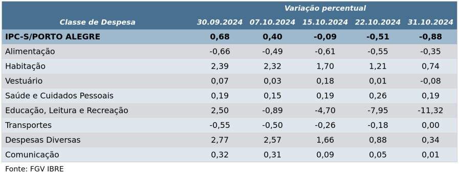 O IPC-S (Índice de Preços ao Consumidor – Semanal) recuou de -0,51% para -0,88% em Porto Alegre na última semana de outubro, de acordo com dados divulgados pela FGV (Fundação Getulio Vargas).