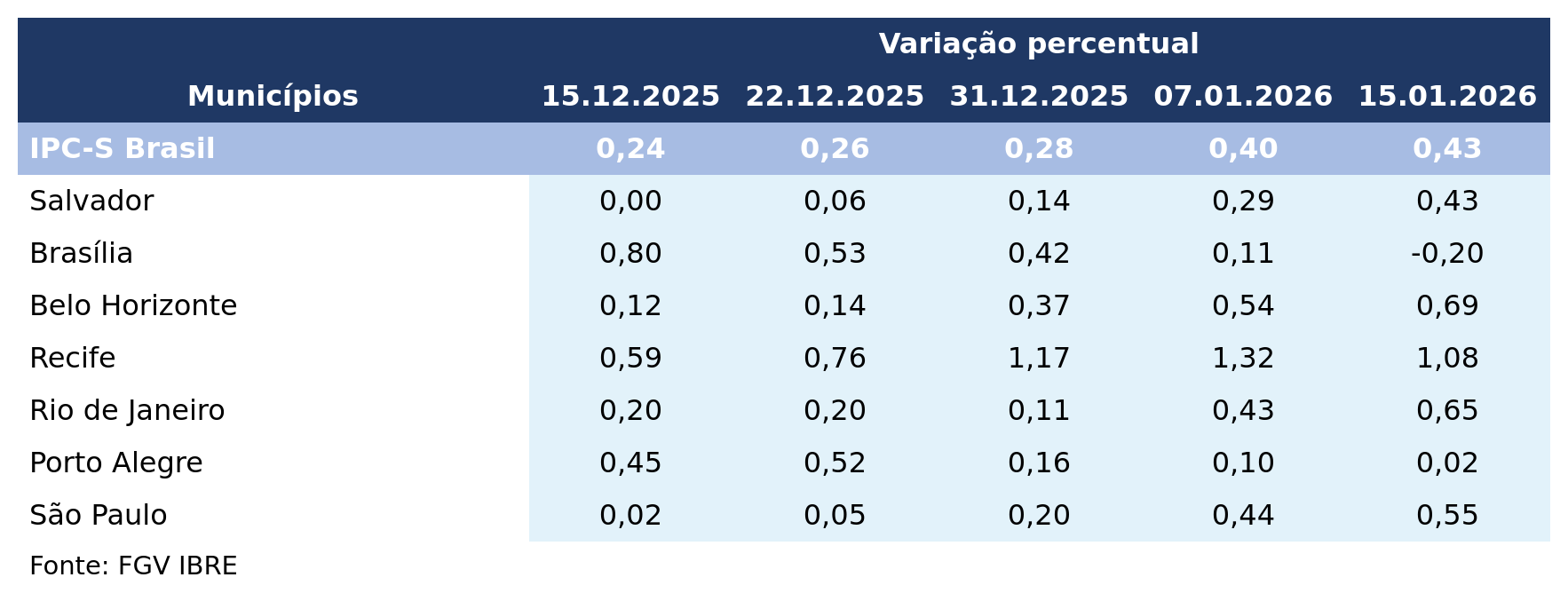 Houve aceleração do IPC-S no Rio de Janeiro (0,43% para 0,65%), em Belo Horizonte (0,54% para 0,69%), Salvador (0,29% para 0,43%) e São Paulo (0,44% para 0,55%).