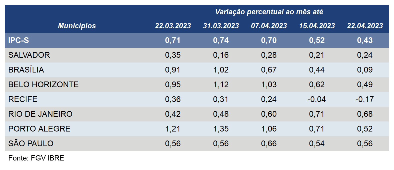 Além de Porto Alegre, o IPC-S desacelerou em outras quatro das sete capitais pesquisadas pela FGV na terceira semana de abril.