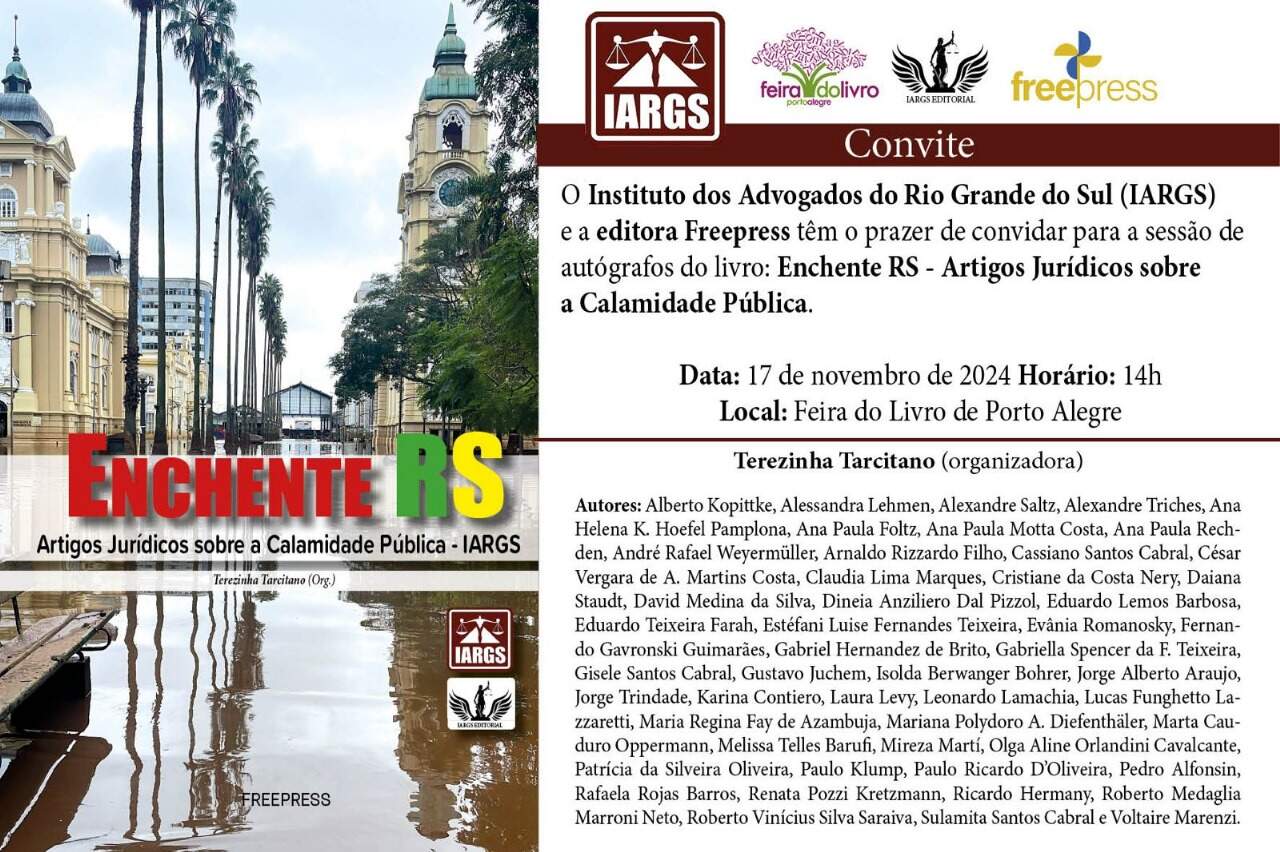 O IARGS (Instituto dos Advogados) lança coletânea inédita sobre as enchentes no Rio Grande do Sul, no dia 17 de novembro, às 14h, na Feira do Livro de Porto Alegre.