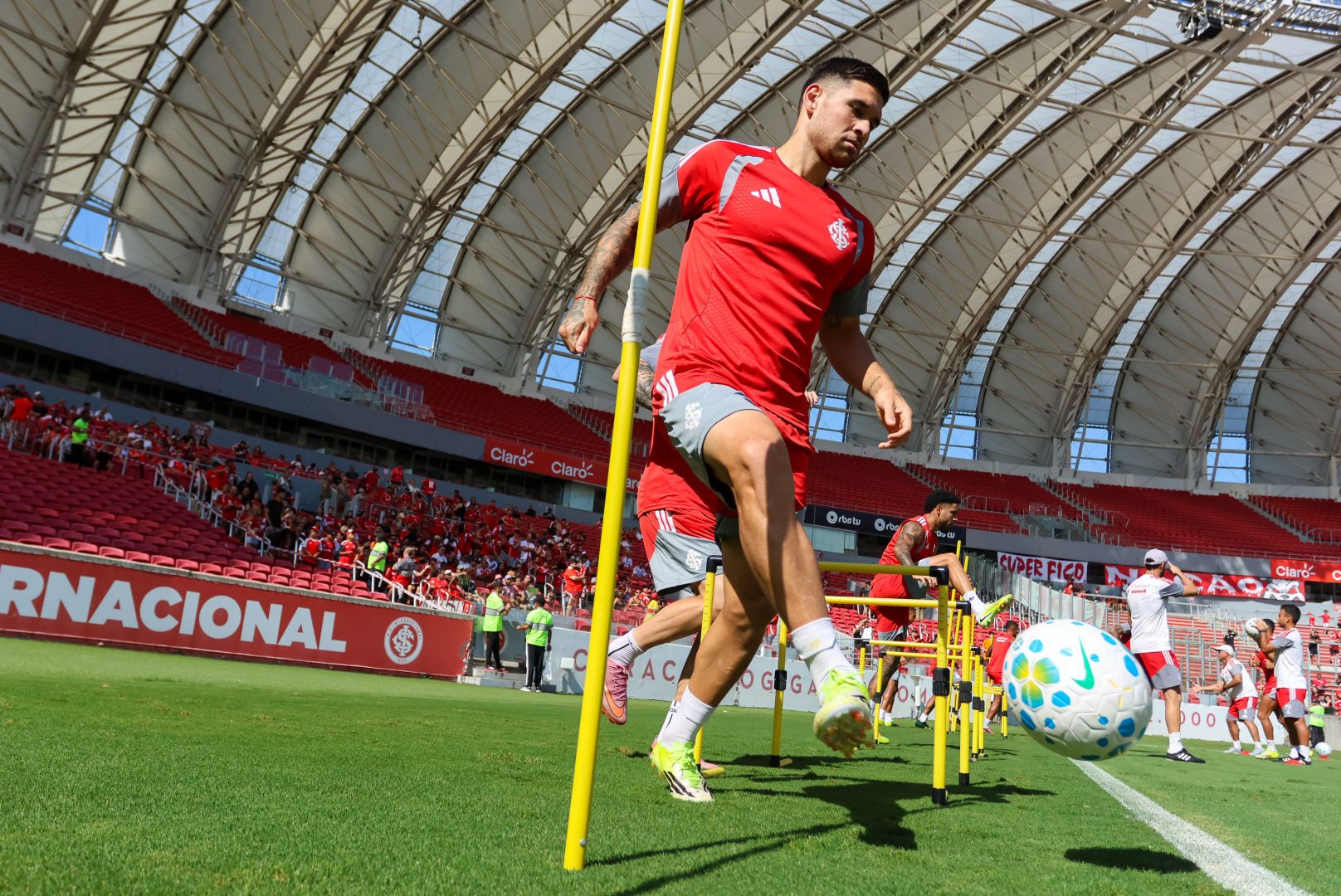 Sob calor de mais de 30 graus em Porto Alegre, o Inter fez um treino aberto para a torcida nesse domingo (29), no Beira-Rio, que apoiou o time na preparação para a partida contra o São Paulo, em casa, na quarta-feira (1º), às 19h30. A atividade durou aproximadamente uma hora e meia e envolveu um trabalho de finalizações, seguido por um treino de construção ofensiva, posse de bola e exercícios táticos no gramado.