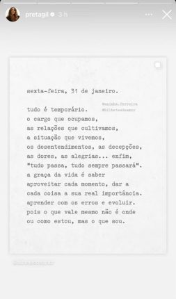 Nesta sexta-feira (31), Preta Gil compartilhou em suas redes sociais uma mensagem motivacional e reflexiva. A artista, que trata um câncer no intestino há dois anos, segue internada após passar por cirurgia de 21 horas para retirada de tumores.