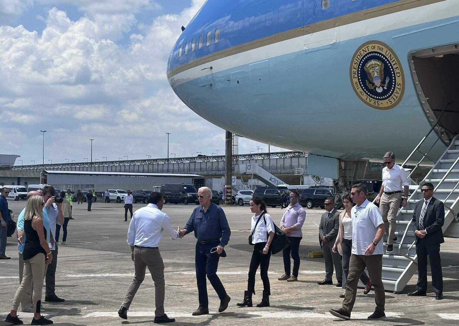 Duas aeronaves do governo americano pousaram na capital amazonense. A primeira aeronave, onde estava o presidente Biden, pousou às 13h30. Uma segunda aeronave pousou às 13h35. Os aviões decolaram de Lima, no Peru, por volta das 11h50.