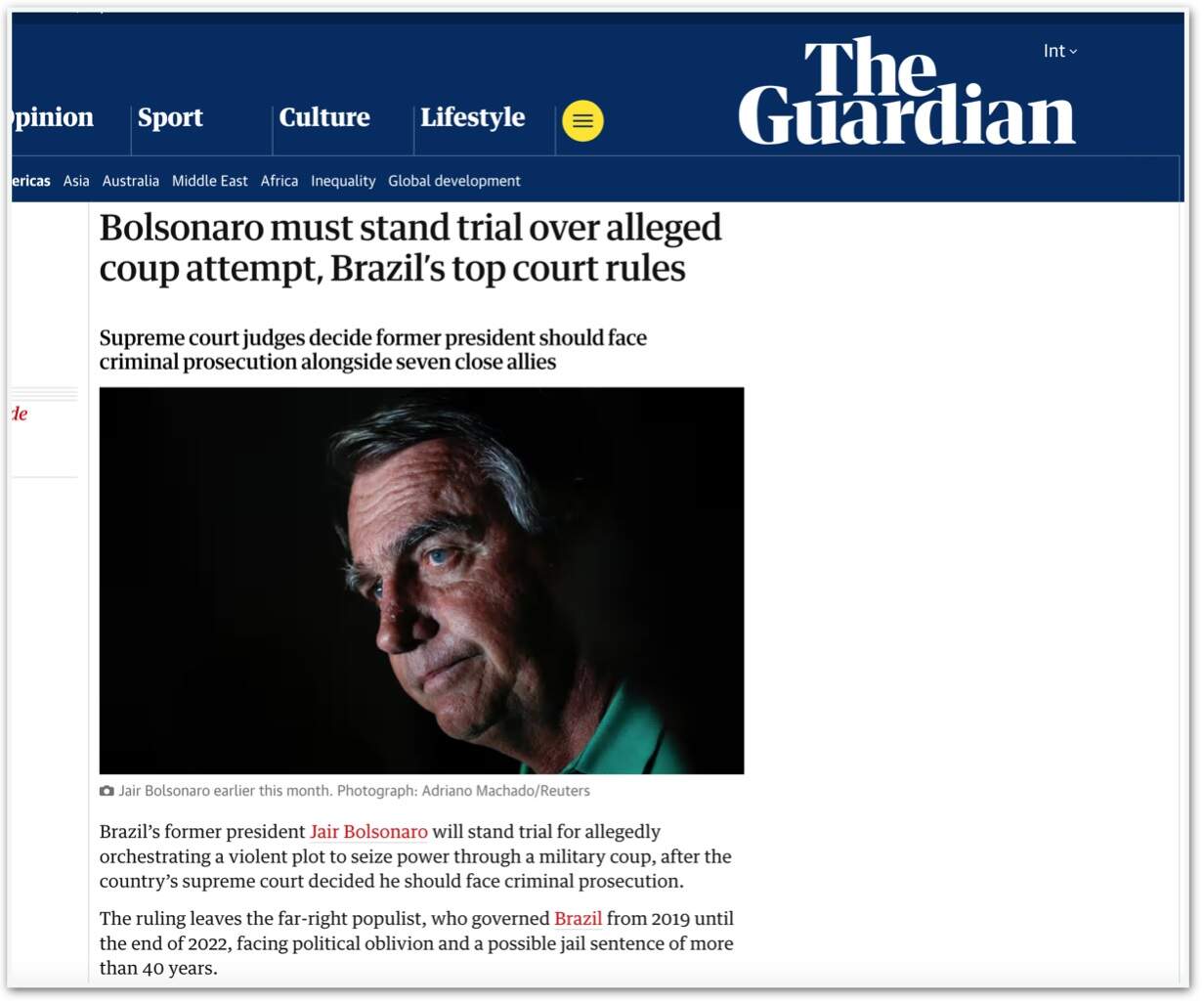 O jornal britânico “The Guardian”, disse que os ataques de 8 de janeiro – que fizeram parte do julgamento que tornou Bolsonaro réu – “foram supostamente incitados como parte de uma tentativa desesperada de devolver Bolsonaro à presidência, contra a vontade pública, criando tumulto que justificaria uma intervenção militar”.