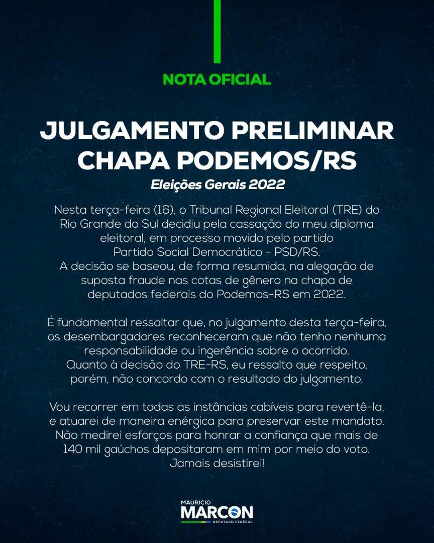 “É com respeito, mas com enorme inconformismo, que o diretório estadual do Podemos recebe a decisão do Tribunal Regional Eleitoral do Rio Grande do Sul em anular os votos de 318.850 gaúchos confiados ao partido na eleição para deputado federal de 2022, no qual elegeu o deputado federal Mauricio Marcon com 140.634 votos”, afirmou o Podemos em nota.
