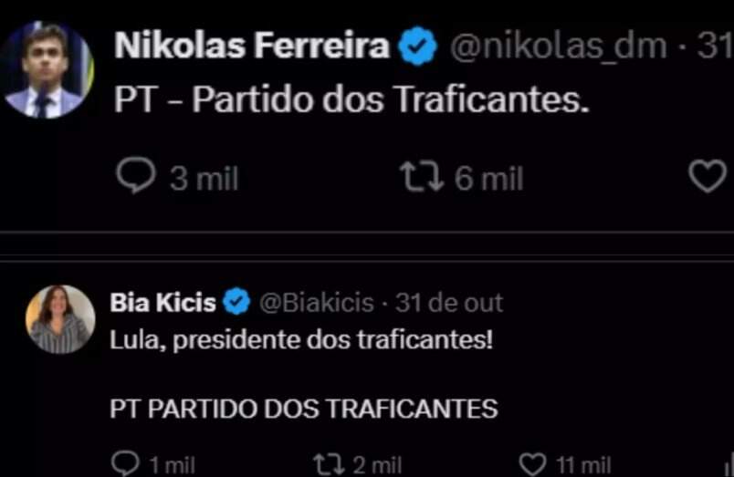 Segundo alegou o PT, após a megaoperação realizada nos complexos do Alemão e da Penha, no Rio de Janeiro, em 28 de outubro, Nikolas e outros parlamentares usaram o X para publicar a referida frase com o objetivo de “degradação da honra objetiva do Partido dos Trabalhadores, tentando de forma vil e repugnante associar a imagem de que o requerente é alinhado com o crime organizado”.