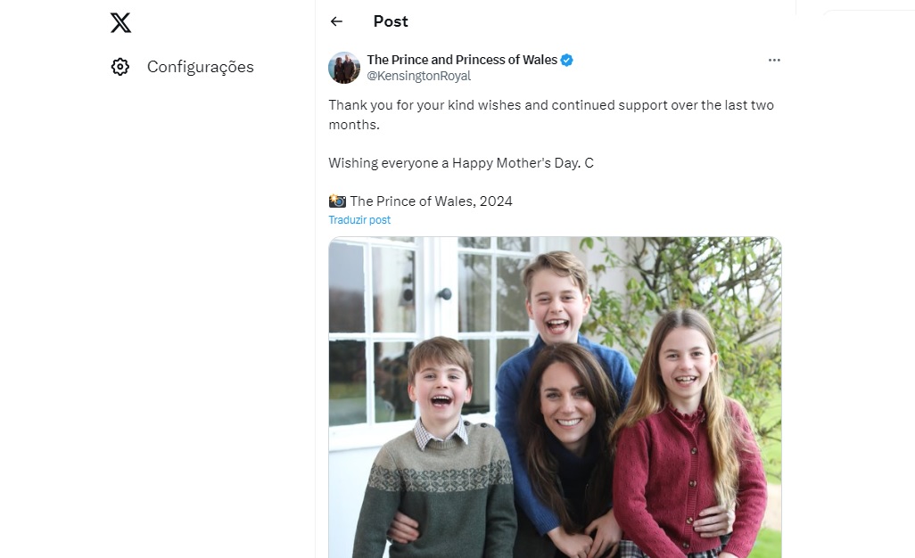 “Obrigado por seus bons votos e apoio contínuo nos últimos dois meses”, escreveu Kate em uma mensagem no X neste domingo (10). “Desejando a todos um feliz Dia das Mães”. No Reino Unido, a data é celebrada no quarto domingo da Quaresma.