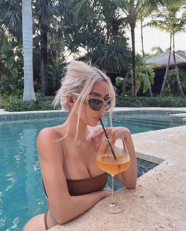 Kim Kardashian alvoroçou os fãs com novos cliques em que aparece aproveitando o verão norte-americano. No Instagram, ela postou um álbum, nesta terça-feira (16), em que pode ser vista dentro da piscina se refrescando com um drink.
