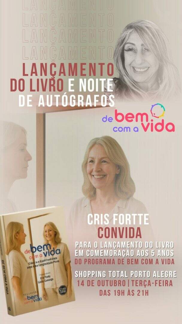 Na próxima terça-feira (14), no palco de eventos do Shopping Total, em Porto Alegre, das 19h às 21h, ocorre o lançamento do livro “De Bem com a Vida”. As organizadoras são Cris Fortte e Lúcia Camargo.
