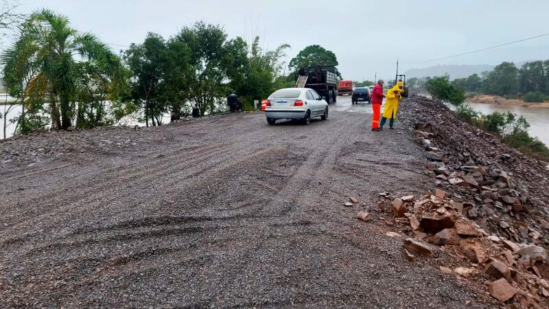 O encontro da cabeceira da ponte com a estrada foi recomposto com aterro e o trânsito foi liberado para veículos leves e pesados na tarde de sexta-feira (10). O sistema pare e siga está funcionando apenas para descarregamento de caminhões que fazem os últimos ajustes no reforço da cabeceira da ponte.