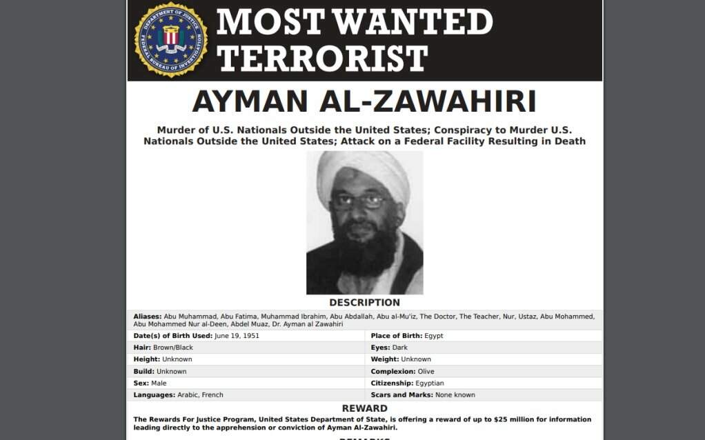 O líder da Al Qaeda, Ayman al-Zawahiri, morto em um ataque de drone no Afeganistão em uma operação especial dos Estados Unidos, segundo fontes, estava na lista dos mais procurados FBI (Departamento Federal de Investigação).