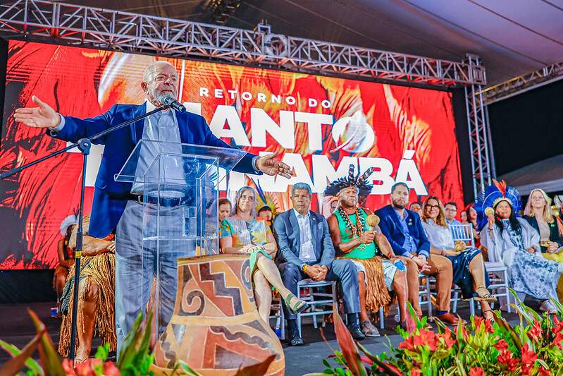 O presidente disse também que o marco temporal criou “dificuldade” para que o governo federal continue fazendo desintrusões como desejava. “Eu vou ver se a gente pode fazer o possível e o impossível para que a gente possa atender, quem sabe, a grandiosidade desse manto sagrado. Se a gente pode, de uma vez por todas, desintrusar as terras tupinambás para que vocês possam viver”, disse o presidente. “É importante lembrar que a nossa luta não é apenas contra aqueles que são contra os indígenas”, também afirmou Lula.
