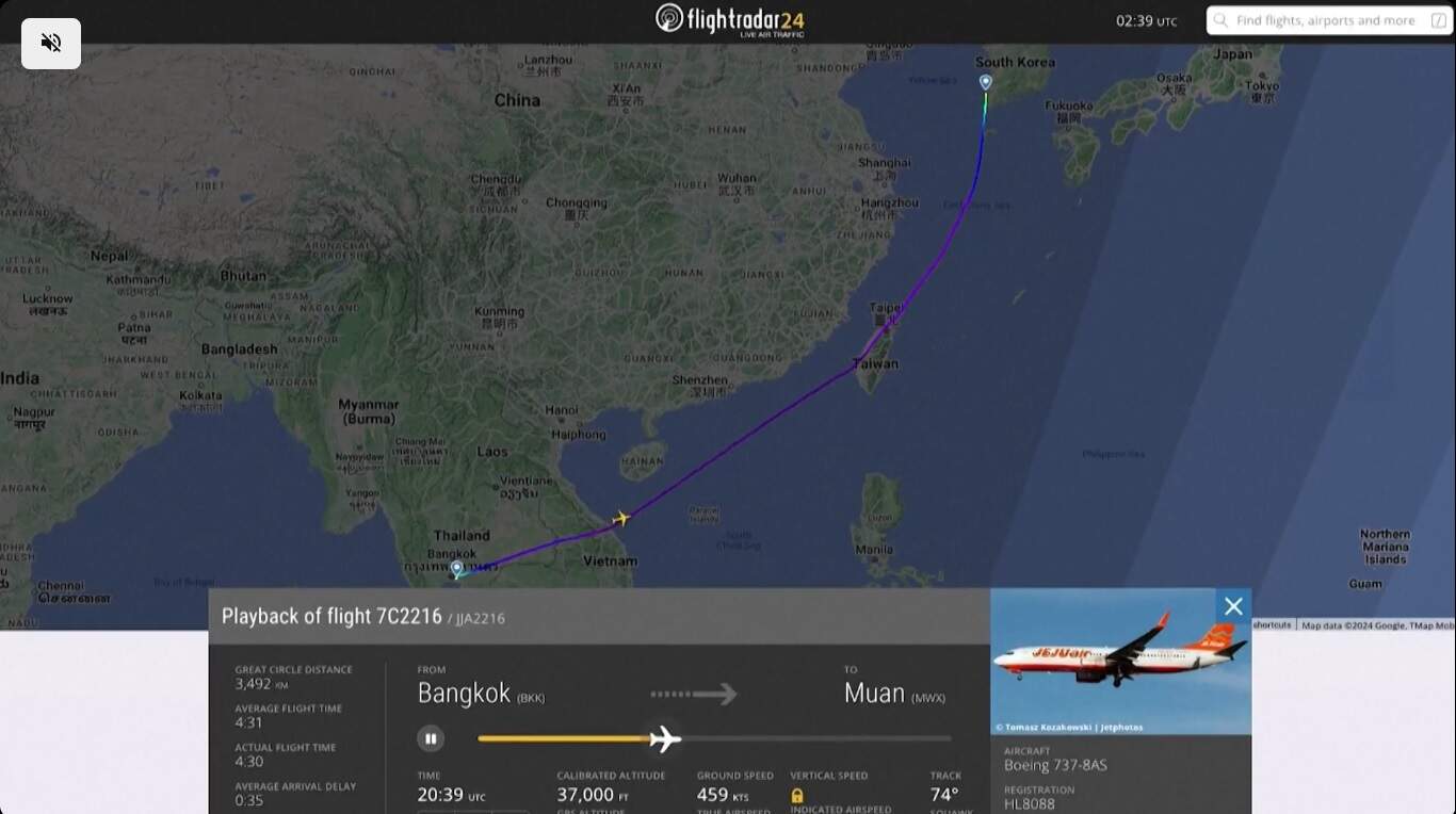 Um vídeo elaborado com informações do site Flightradar24 registra a rota percorrida pela aeronave, que havia decolado de Bangkok, na Tailândia, com destino a Muan, no sul da Coreia do Sul.