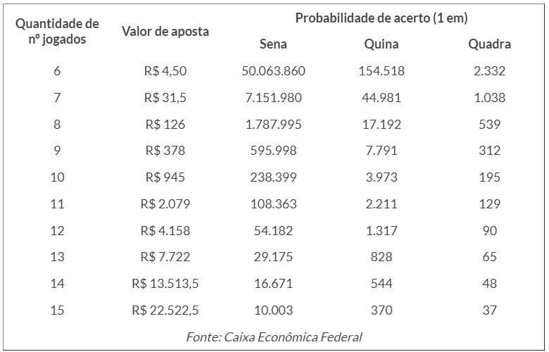 Para preencher 15 números, por exemplo, o jogador precisa desembolsar R$ 22,5 mil. Realizando a aposta de seis números, as chances de ganhar o prêmio são uma em mais de 50 milhões. Já com o preenchimento de 15 números, as chances aumentam para uma em 10 mil.