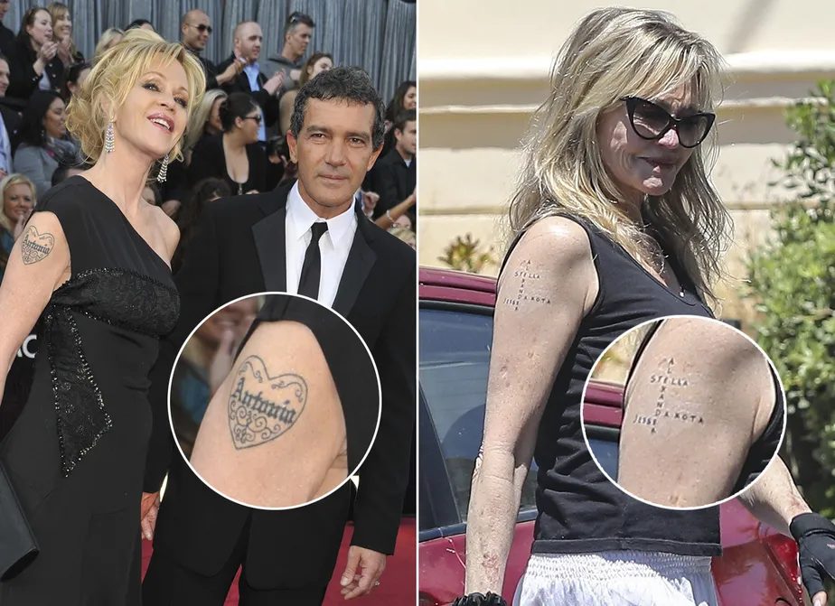 No lugar da antiga tatuagem, que continha um coração e o nome “Antonio”, homenagem ao ator, agora a atriz ostenta os nomes de seus filhos: Alex e Dakota, de outros relacionamentos, Jesse, que é seu enteado, e Stella, sua filha com Antonio Banderas.