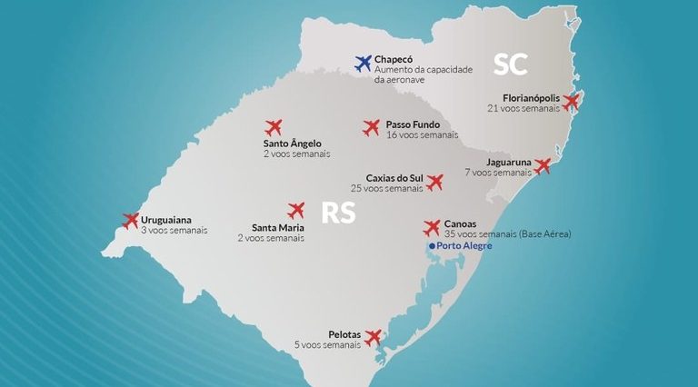 Confira a malha aérea emergencial: Aeroporto de Caixas do Sul – 25 voos semanais; Aeroporto de Santo Ângelo – 2 voos semanais; Aeroporto de Passo Fundo – 16 voos semanais; Aeroporto de Pelotas – 5 voos semanais; Aeroporto de Santa Maria – 2 voos semanais; Aeroporto de Uruguaiana – 3 voos semanais; Base aérea de Canoas – 35 voos semanais; Aeroporto de Florianópolis – 21 voos semanais; Aeroporto de Jaguaruna – 7 voos semanais; Aeroporto de Chapecó – aumento de capacidade da aeronave.