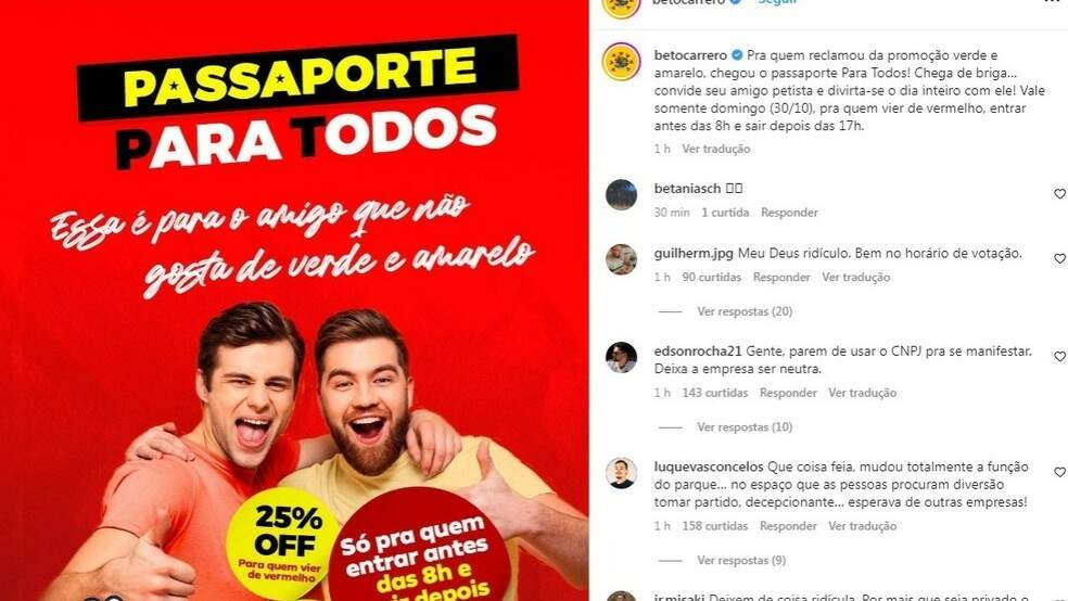 Poucos dias atrás, a Beto Carrero World havia feito uma promoção para quem fosse vestido “de verde e amarelo”, em referência a eleitores do candidato Jair Bolsonaro.