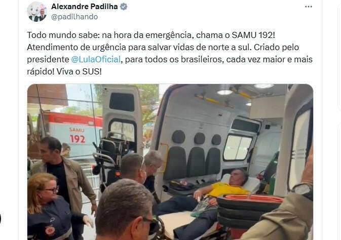 O ministro da Saúde, Alexandre Padilha (PT), usou uma foto de Jair Bolsonaro que registra o momento em que o ex-presidente foi socorrido por paramédicos nessa sexta-feira (11) para elogiar o Serviço de Atendimento Móvel de Urgência (Samu), criado pelo presidente Luiz Inácio Lula da Silva em seu primeiro mandato. O post foi feito após a divulgação da notícia de que Bolsonaro foi internado após sentir fortes dores no abdômen, em decorrência de complicações provocadas pela facada sofrida nas eleições de 2018.