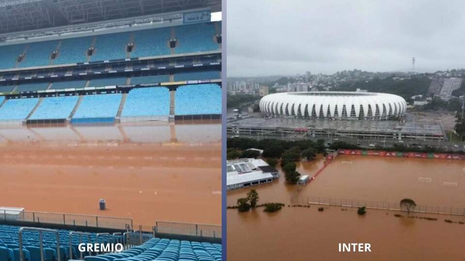 Grêmio e Inter tiveram suas estruturas afetadas pela enchente histórica no Rio Grande do Sul. Os gramados do Beira-Rio e da Arena do Grêmio, principais estádios de Porto Alegre, foram alagados no fim de semana.