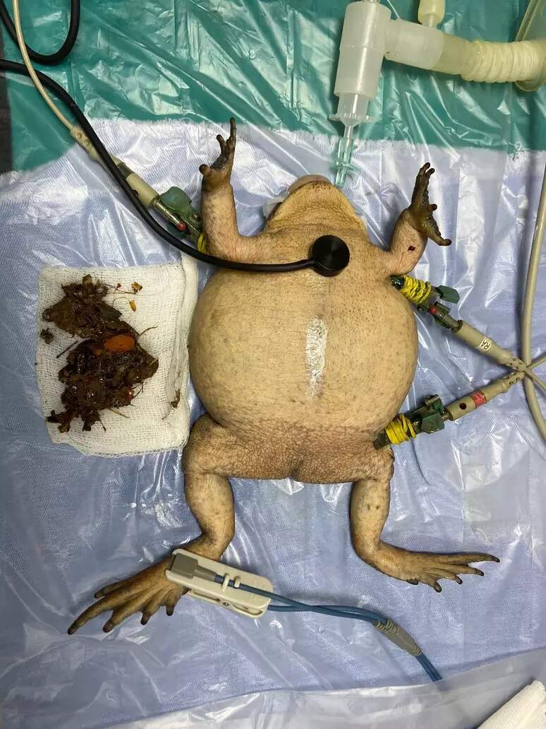 Estima-se que o sapo tenha ficado cerca de três dias com a boca colada, apresentando sinais de desnutrição e desidratação. No hospital, o animal foi estabilizado, hidratado e recebeu nutrição intravenosa. Em seguida, iniciou-se o processo de remoção da cola, que levou cerca de 18 horas. Após a retirada da cola, a equipe de veterinários realizou exames e constatou, por meio de raio-X, a presença de um corpo estranho no estômago. Assim, o sapo precisou passar por uma cirurgia para desobstrução.