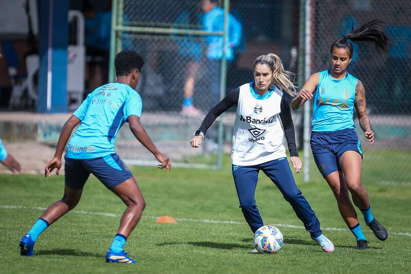 No campo, as jogadoras foram divididas em dois grupos. Um deles trabalhou troca de passes rápidos com pressão e recuperação em pequenos quadrantes, sob orientação da equipe de preparação física. As goleiras, por sua vez, realizaram atividades específicas com o treinador Alex Oliveira e o auxiliar Luis Alberto.
