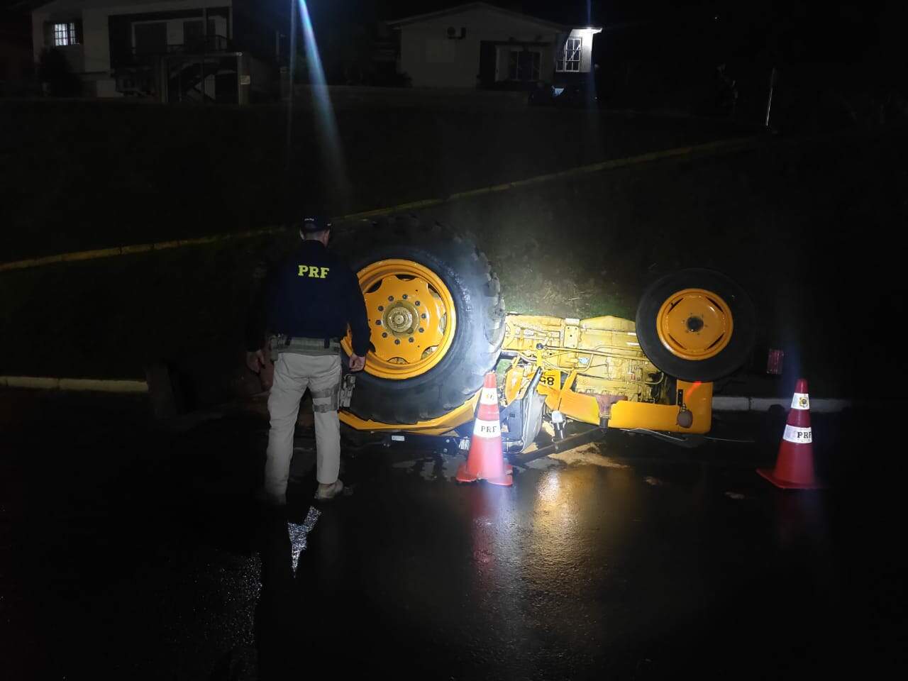 A PRF (Polícia Rodoviária Federal) prendeu, na noite de sexta-feira (03), o motorista de um trator que capotou o veículo no acostamento da BR-470, em Barão, no Vale do Rio Caí. O homem, que apresentava sinais de embriaguez, se recusou a fazer o teste do bafômetro.