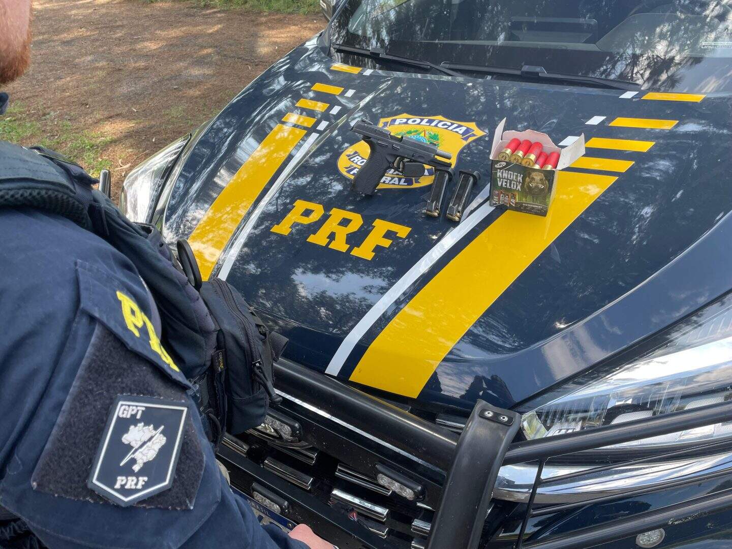 Questionado sobre a presença de armas de fogo no veículo, o condutor negou. No entanto, ao realizar busca veicular, os PRFs encontraram uma pistola calibre .380, pronta para uso, além de dois carregadores municiados, contendo ao todo 32 munições. Também foram encontradas 28 munições calibre 12 no interior da Saveiro. O homem não possuía autorização para portar o armamento ou transportar as munições.