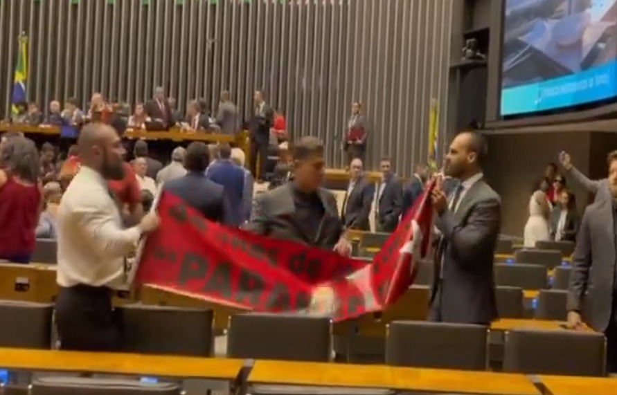 A cena foi compartilhada no X, ex-Twitter, pelo deputado Lindbergh Farias (PT-RJ). Enquanto os parlamentares seguravam a faixa, houve trocas de insultos e exaltação. O deputado petista que gravou o momento, pergunta aos bolsonaristas “e o ladrão de joias?”, fazendo referência ao caso das joias sauditas, revelado pelo Estadão, em que o ex-presidente Jair Bolsonaro (PL) tentou trazer ilegalmente ao Brasil um conjunto de colar, anel, relógio e um par de brincos de diamantes avaliados em € 3 milhões, o equivalente a R$ 16,5 milhões.