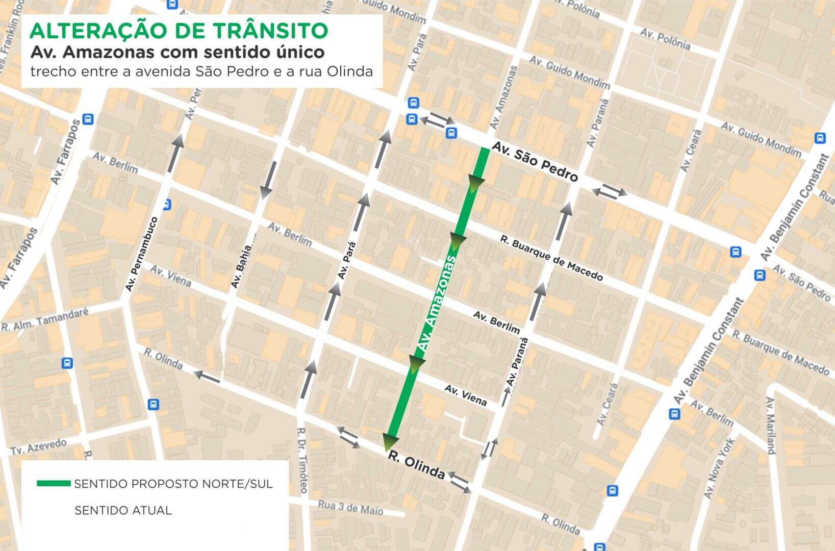 Nesta quinta-feira (14), o trânsito de veículos da avenida Amazonas (bairro São Geraldo), na Zona Norte de Porto Alege, passa a ter sentido único no trecho entre a avenida São Pedro e a rua Olinda, sentido Norte-Sul. Conforme a Secretaria Municipal de Mobilidade Urbana (SMMU), o objetivo é melhorar a fluidez viária na região.