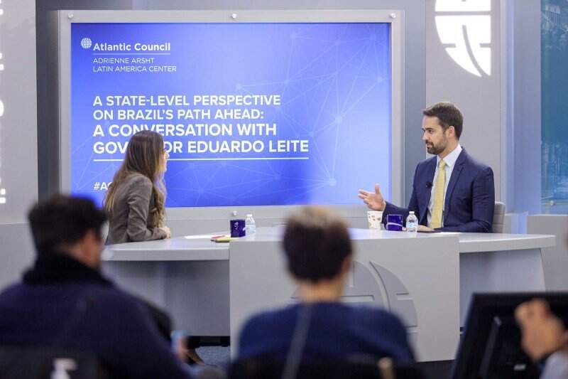 Intitulada “A state-level perspective on Brazil’s path ahead: a conversation with governor Eduardo Leite” (Uma perspectiva em nível estadual sobre os rumos do Brasil: uma conversa com o governador Eduardo Leite), a conversa foi mediada pela diretora associada no Adrianne Arsht Latin America Center, Valentina Sader, e girou em torno de diversos assuntos.