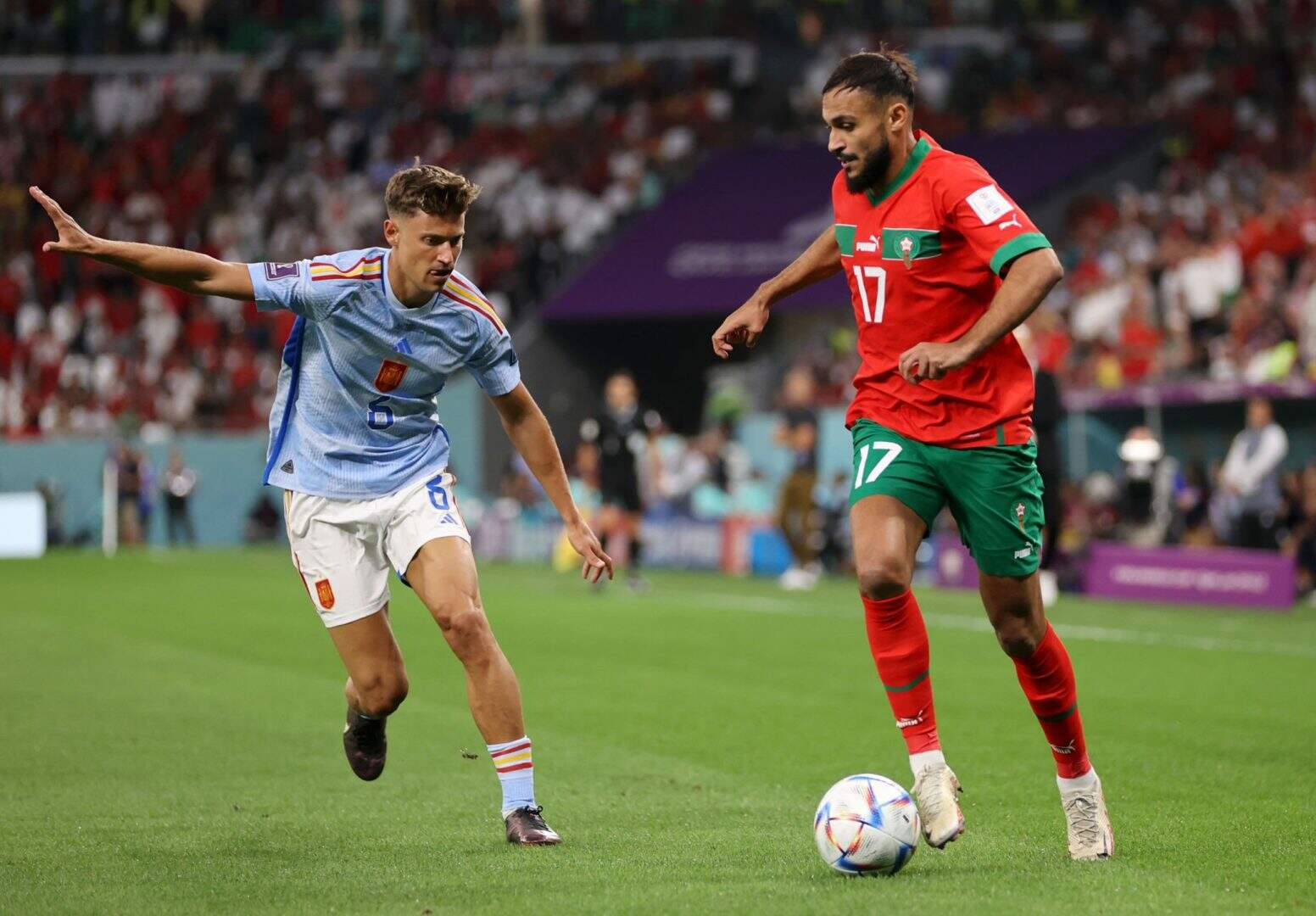 Aos 32, Mazraoui chegou pelo meio campo e chutou muito forte de fora da área. Unai Simón espalmou e fez uma grande defesa. Aos 39, Gavi caiu pela esquerda, foi para o fundo e entrou na área. Mazraoui atento, conseguiu tirar a bola para longe.