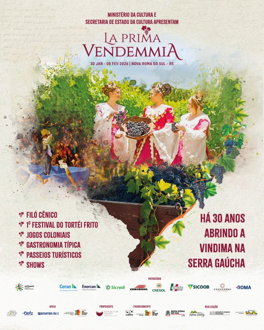 A 15ª La Prima Vendemmia inicia em Nova Roma do Sul na sexta-feira (30), reunindo moradores e visitantes em uma programação que se estende por dois finais de semana, nos dias 30 e 31 de janeiro e 1º de fevereiro e 6, 7 e 8 de fevereiro. A festa transforma a cidade da Serra Gaúcha em um grande palco de celebração da cultura, da agricultura e da convivência comunitária.