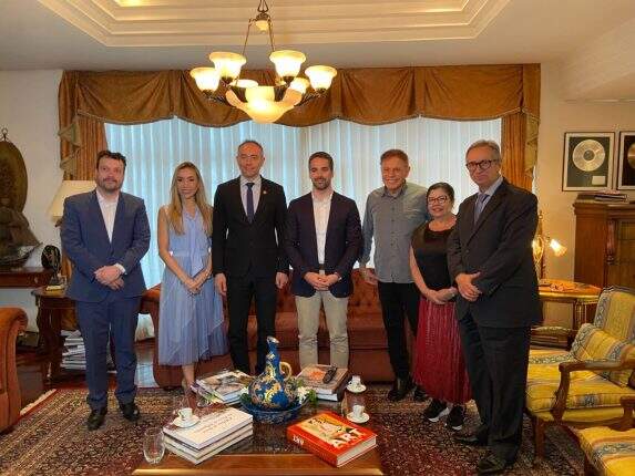 O governador Eduardo Leite e os secretários de Estado Artur Lemos e Tânia Moreira foram recebidos pela diretoria da Rede Pampa. Foto: O Sul