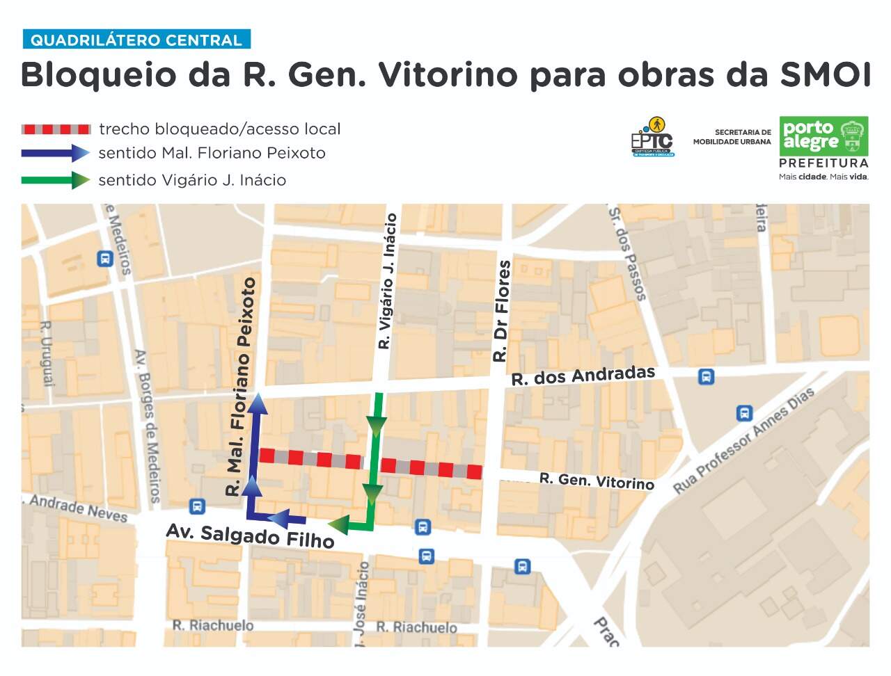 Em razão das obras, o trânsito fica bloqueado na via entre as ruas Marechal Floriano Peixoto e Dr. Flores, sendo mantido aberto o cruzamento da rua Vigário José Inácio. Com isso, Marechal Floriano e Vigário José Inácio terão sentidos invertidos entre a General Vitorino e a Andradas.