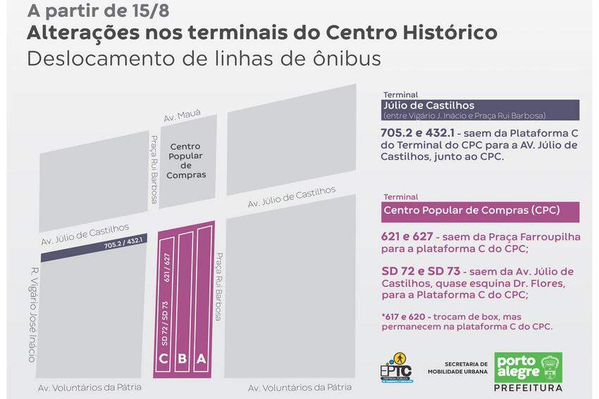 – Linhas 621 (621 Nova Gleba/Santa Rosa), 627 (Agostinho): terminal alterado da Praça– Farroupilha para Plataforma C do Terminal do Centro Popular de Compras (CPC).