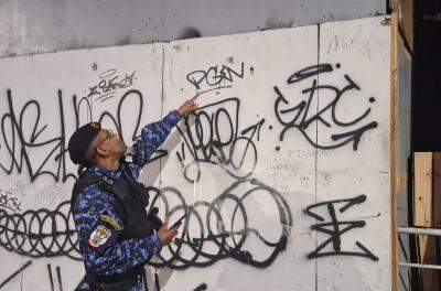O crime foi flagrado por câmeras de vigilância. Os agentes apreenderam sete latas de spray, cinco latas de tinta e uma faca. Os vândalos, que têm entre 19 e 36 anos, foram encaminhados à 2ª Delegacia de Pronto-Atendimento da Polícia Civil para o registro da ocorrência.