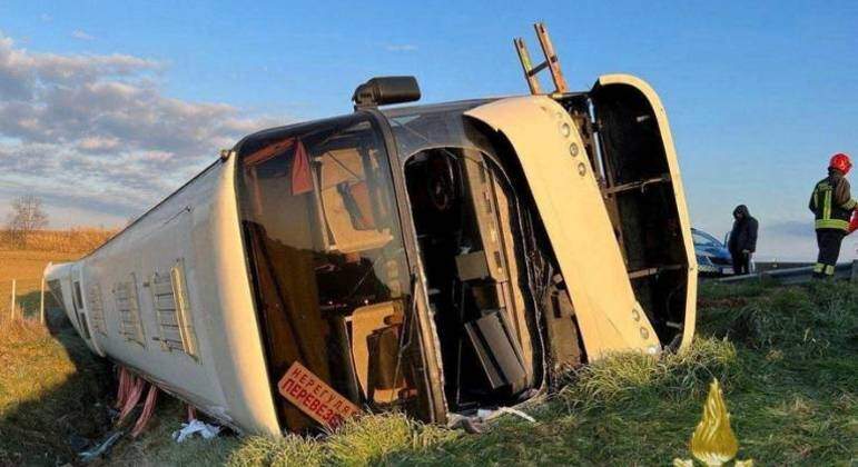 Um ônibus que transportava cerca de 50 ucranianos saiu da estrada na Itália e capotou, deixando um morto e vários feridos, disseram bombeiros neste domingo (13).