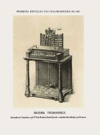 Na teoria: o engenho é atribuído ao americano Christopher Sholes, em 1867, com várias contribuições de outros… americanos. Na prática: anos antes, em 1861, o padre paraibano Francisco João de Azevedo expunha na Exposição Nacional, no Rio de Janeiro, a “máquina taquigráfica” — como batizou sua criação —, um aparelho que imprimia sinais taquigráficos apenas apertando teclas. Ganhou medalha de ouro. Ainda assim, não foi escolhido para representar o Brasil na Exposição Universal, em Londres.
