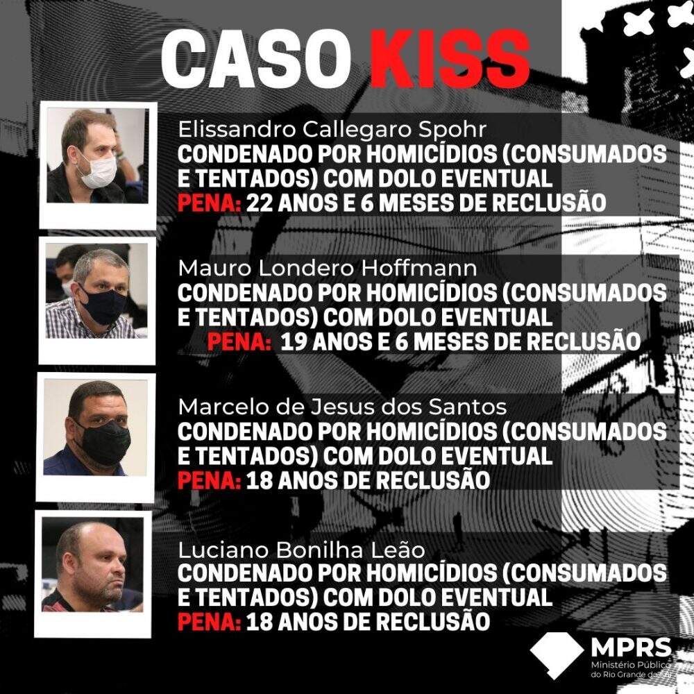 Elissandro Spohr foi sentenciado a 22 anos e seis meses de prisão, a maior pena. Mauro Hoffmann foi condenado a 19 anos e seis meses. Já Marcelo de Jesus e Luciano Bonilha foram sentenciados a 18 anos de prisão cada. As penas foram estipuladas pelo juiz Orlando Faccini Neto, após a decisão dos jurados no Foro Central de Porto Alegre.