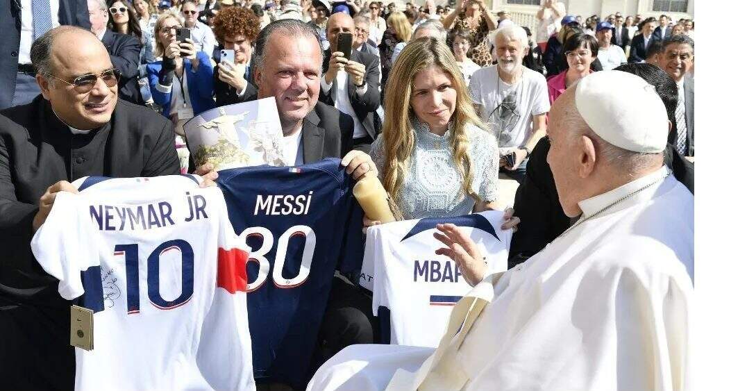 O papa Francisco abençoou três camisas autografadas pelos craques Messi, Mbappé e Neymar que serão doadas para um leilão em prol das vítimas das enchentes no Rio Grande do Sul.