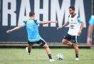 Logo após o aquecimento orientado pelo preparador físico Reverson Pimentel, os jogadores passaram para o comando de Renato, que complementou das atividades no gramado. Troca de passes, transição entre os setores e finalizações no gol complementaram o treinamento.