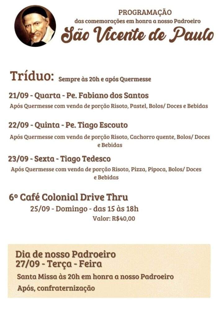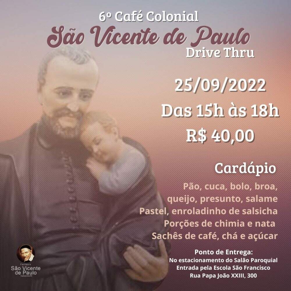 A Paróquia São Vicente de Paulo, em Cachoeirinha, na Região Metropolitana de Porto Alegre, promoverá no domingo (25), das 15h às 18h, um café colonial no sistema drive-thru em comemoração ao dia do padroeiro da igreja e da cidade, celebrado em 27 de setembro.