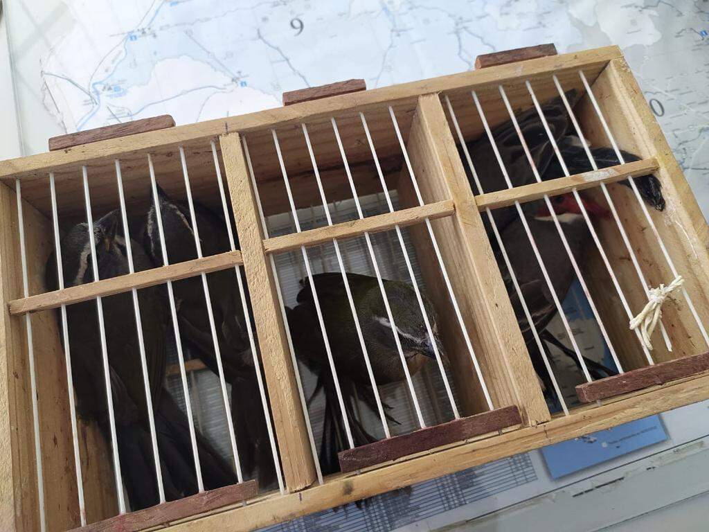 Atrás do banco do carro foram localizados cinco pássaros silvestres em uma pequena gaiola dentro de uma sacola plástica, em péssimas condições, sem ventilação, iluminação e espaço adequados. Eram pássaros das espécies trinca-ferro e cardeal.