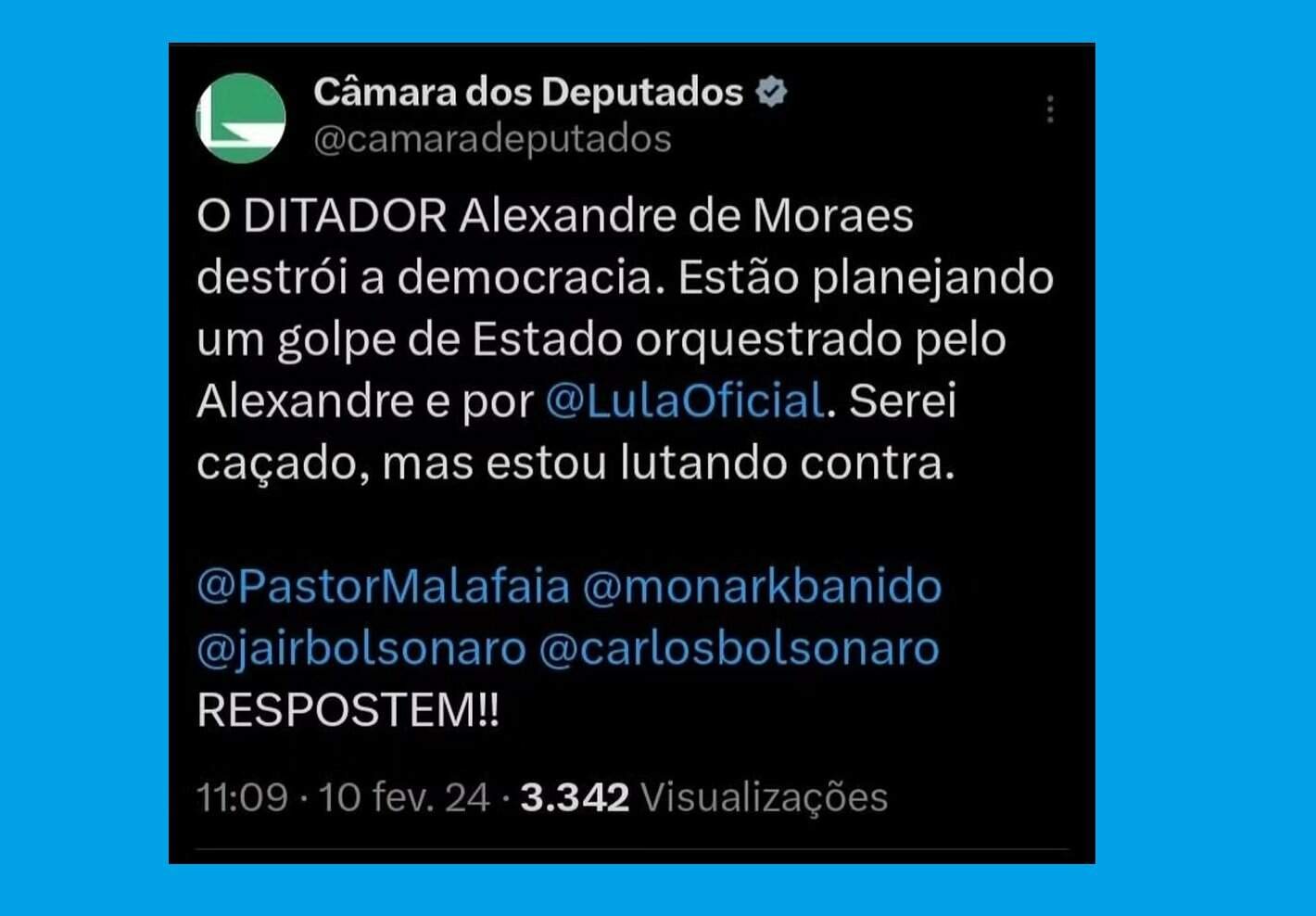 “O perfil da Câmara dos Deputados no Twitter publicou o seguinte post: O DITADOR Alexandre de Moraes destrói a democracia. Estão planejando um golpe de Estado orquestrado pelo Alexandre e por @LulaOficial. Serei caçado, mas estou lutando contra”, afirmou a postagem.
