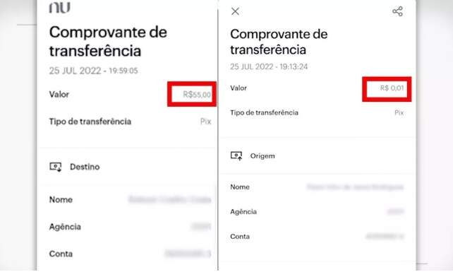 Com os dados da transferência de R$ 0,01, o homem editou o comprovante e alterou o valor para R$ 55, o valor da pizza.