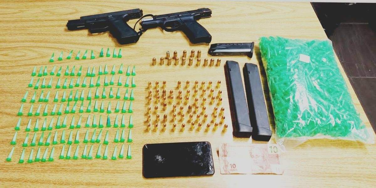 Em Canoas, os policiais militares do 15º BPM prenderam uma dupla de traficantes com 122 pinos de cocaína no bairro Guajuviras. Houve ainda a apreensão de uma pistola calibre 40 com um carregador e 15 munições, uma pistola calibre nove milímetros com dois carregadores e 59 munições, além de um pacote de pinos vazios, um telefone celular e R$ 10,00 em dinheiro.