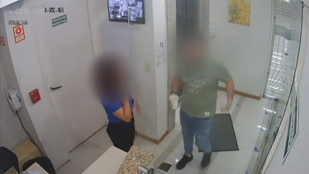 Nas imagens é possível ver quando o homem pega a mulher, de 46 anos, pela camisa, aponta o dedo e ameaça dar socos. Em um determinado momento ele chega a empurrá-la.