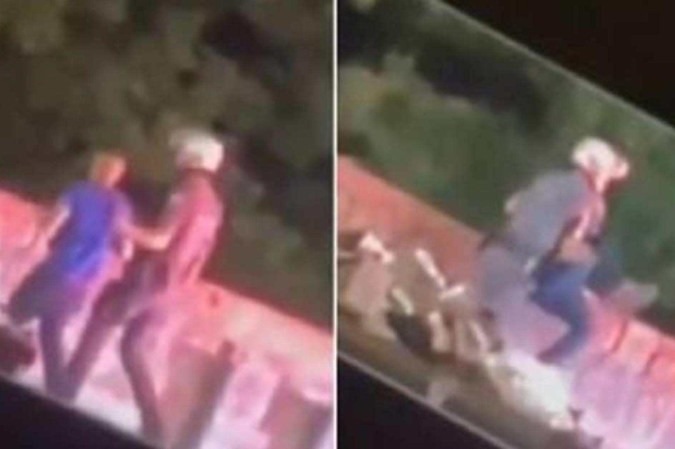 Pelas imagens, é possível ver um policial levantando uma moto que está no chão. Um segundo e um terceiro policial se aproximam. Depois, o primeiro PM encosta a moto perto da ponte. Um quarto policial chega segurando o homem pela camiseta azul, que seria o motociclista abordado. Ele se aproxima da beirada da ponte e joga o homem no rio.