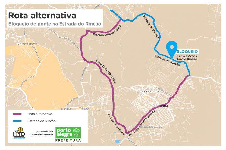 A EPTC (Empresa Pública de Transporte Circulação) informa que, a partir desta sexta-feira (23), a Estrada do Rincão, no bairro Restinga, na Zona Sul de Porto Alegre, será bloqueada para o trânsito de veículos nas proximidades da ponte, que apresenta risco iminente de colapso. A nova ponte sobre o Arroio Rincão está em fase de execução de projeto através da Secretaria de Obras e Infraestrutura.