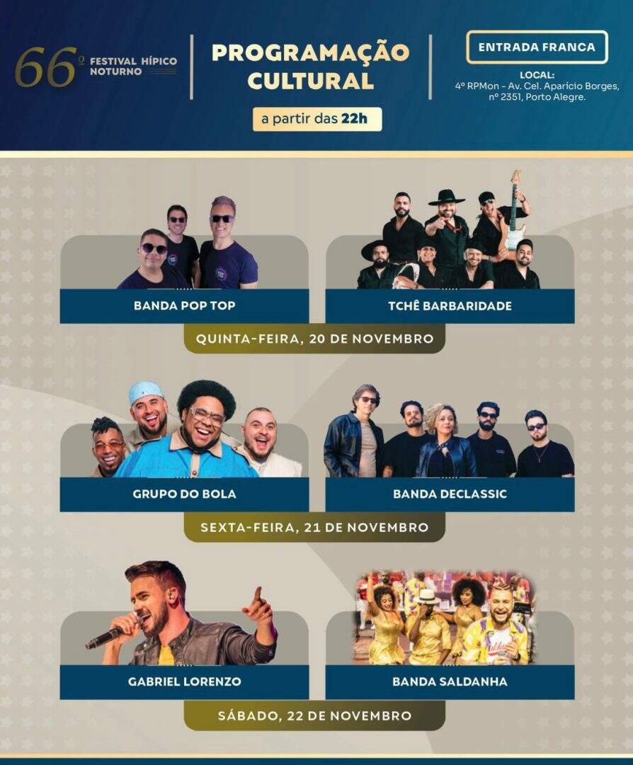 A programação conta com ainda com atrações músicas nas três primeiras noites que ocorrerão no lounge cultural com nomes como Tche Barbaridade, Banda Pop Top, Grupo do Bola, Banda DeClassic, Gabriel Lourenzo e Banda da Saldanha prometem animar a o festival e possuem o financiamento da Lei de Incentivo à Cultura – Lei Rouanet – Ministério da Cultura.